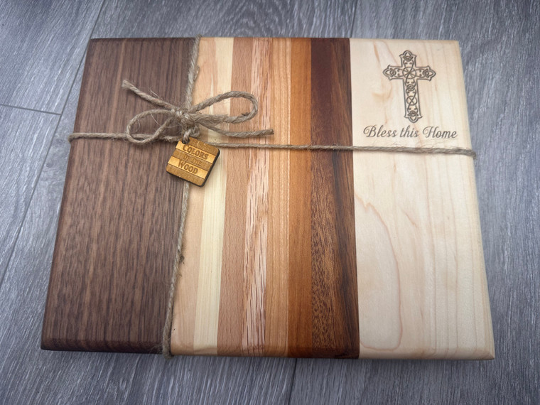 This particular style cutting board has a gradient style with an engraving that says the phrase "Bless this Home" with a cross image above it.